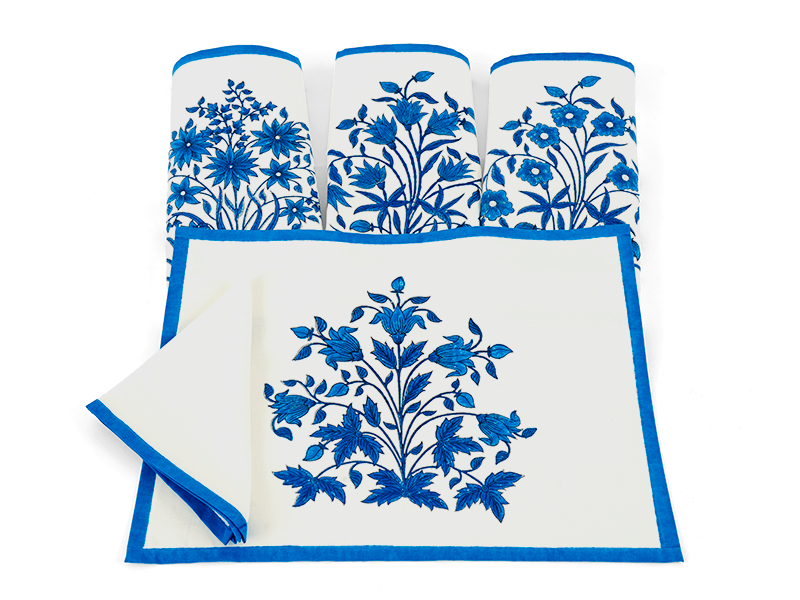 Inspired by the Mughal love of flowers, each placemats has been hand-block printed in the traditional workshops of Jaipur artisans. The series come in a set of four and includes napkins.